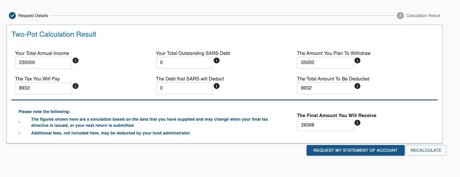 Log into your filing and click on the Two-pot Calculator. You can also get the calculator directly on the SARS website(click to view tool).
